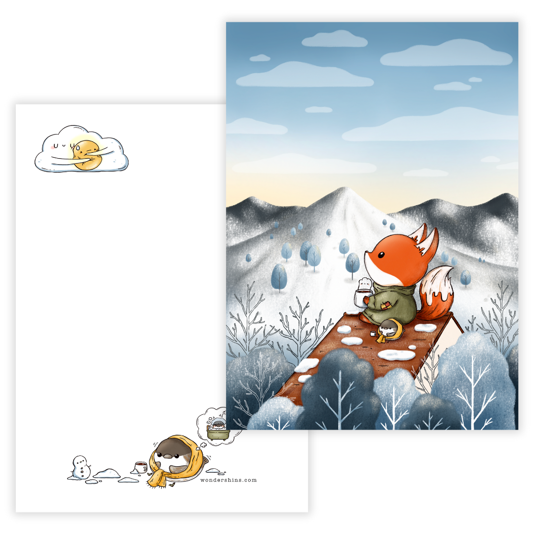 It’s a snowy day! Filbert the Fox and Pip the Chickadee wake up to find the world blanketed in fluffy, white snow. They make a hot cup of tea and sit on the rooftop to admire the view and watch the sun continue rising. (Pip is quite cold, though! 😂 As dreamy as this moment is, he cannot help but wish to be in a hot, steamy bath!) What a way to start the day!